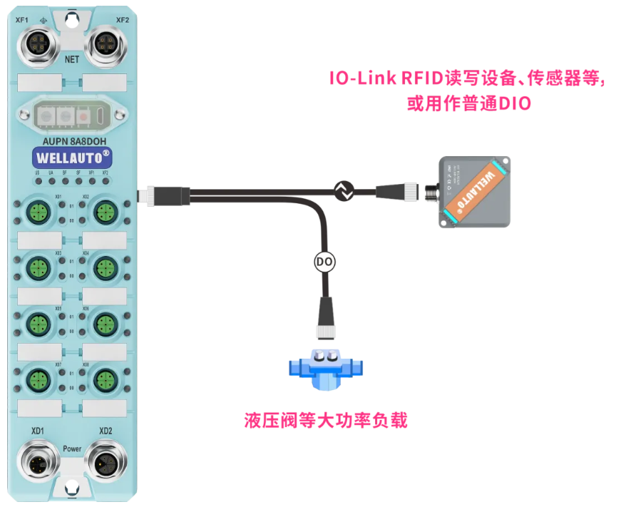 在I/O性能上,这款模块堪称“全能选手”:最大支持8路DI输入(PNP型),16路DO输出,其中8路DO支持单通道2A大电流PNP输出,适配大功率执行器;另外8路DO支持单通道0.2A输出,且NPN/PNP可配置,兼容各类传感器和控制元件。此外,模块的DI/DO/IO-Link接口可通过软件灵活配置,同一接口虽不能同时复用多种协议,但多样化的组合方式能大幅降低设备选型难度。