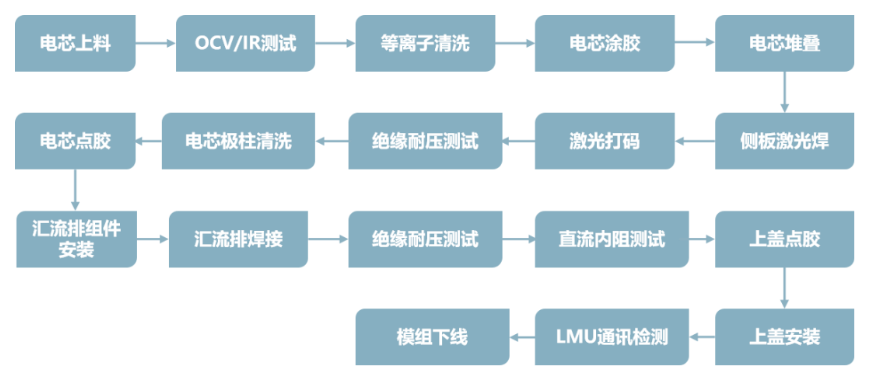 锂电池Pack模组自动线实现智能化装配和测试,通过组件清洗、涂胶、电芯堆叠、绝缘耐压测试等工序对不同规格的电池设计出不同的模组排列方式、焊接与测试方案。