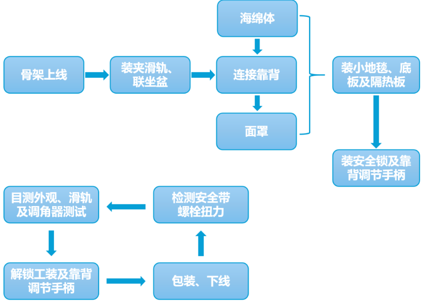 汽车座椅装配流程严谨有序,确保每一个部件精准适配,具体流程如下:首先,座椅骨架上线,完成滑轨与联座盆的安装;随后,将海绵体与面罩固定于靠背上,搭建座椅基本形态;接着,依次安装小地毯、底板及隔热板,完成座椅初步组装;最后,装配安全锁与靠背调节手柄,对安全带螺栓扭力进行精准检测,并开展外观、滑轨及调节器的全面测试,经包装后即可下线。
